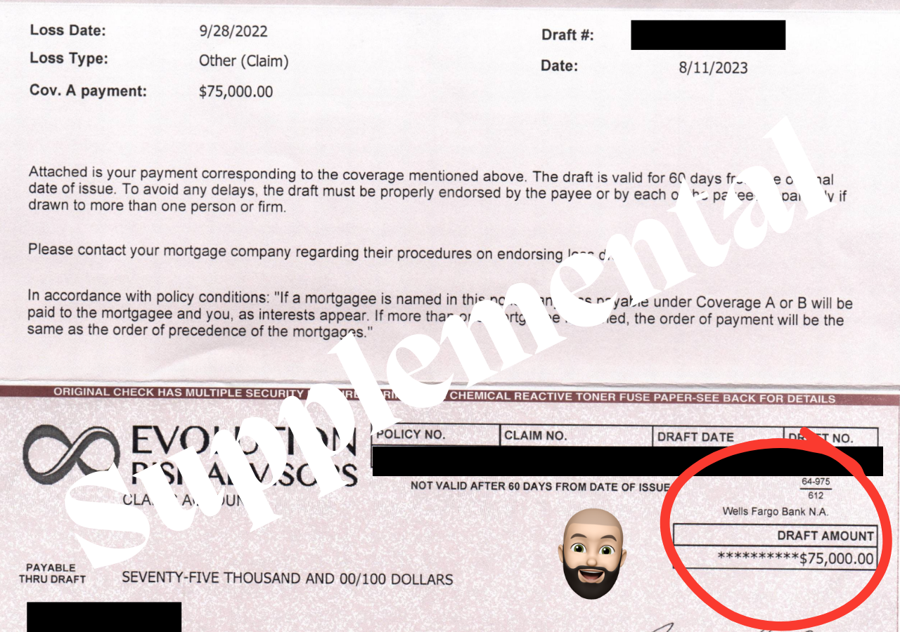 The check will have ALL interested parties. This means you may see a check with: You (the insured), Excellent Standard LLC (our public adjusting firm), and/or your mortgage company (if you still have one).